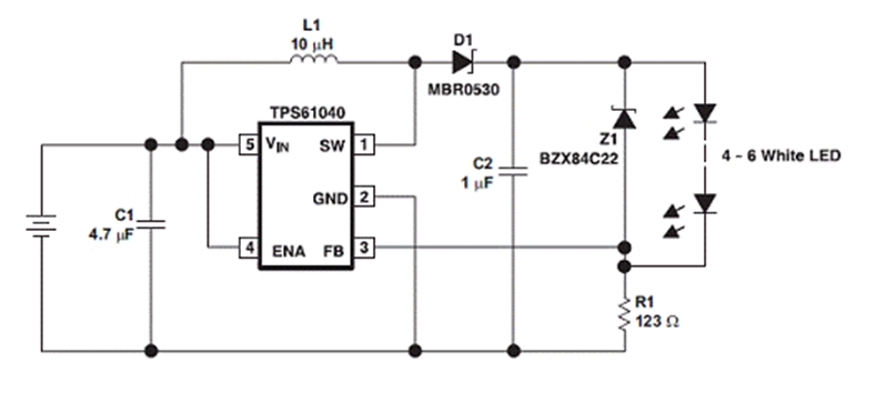 以下電路可生成 101mA 的恒定電流,能為 PDA 和數(shù)碼相機(jī)等便攜式應(yīng)用驅(qū)動高達(dá) 6 個白色 LED">LED。其輸入電壓工作范圍為 1.8 V 至 6 V,可以采用兩節(jié)堿性電池或鎳氫電池輸入(1.8 V 到 ~3 V)、三節(jié)堿性電池或鎳氫電池輸入(2.7 V 到 ~4.8 V)以及單體鋰離子電池輸入(3 V~4.2 V)。這種升壓轉(zhuǎn)換器采用 R1 來設(shè)置流過 LED">LED 的恒定電流。TPS61040 產(chǎn)品說明書 (SLVS413) 給出了本電路的詳細(xì)描述。