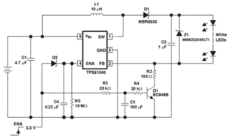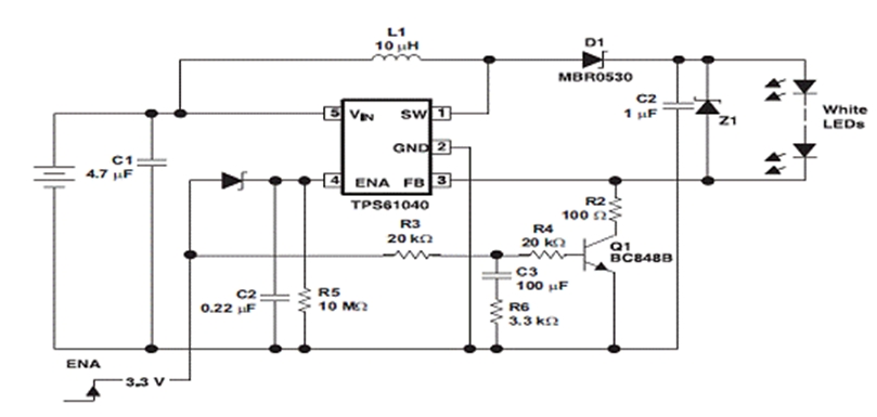 許多采用白光 LED">LED 照明和背光的消費類產(chǎn)品都支持開關(guān)時的漸進(jìn)性 LED">LED 發(fā)光變化。這種漸進(jìn)性的發(fā)光變化通常要借助可提供 PWM 發(fā)光變化控制功能的微處理器來完成。在此,我們將介紹一款采用德州儀器 (TI) TPS61040 白光 LED">LED 驅(qū)動器的電路,其在不使用微處理器的情況下同樣也可以實現(xiàn)開關(guān)時的漸進(jìn)性發(fā)光變化。
