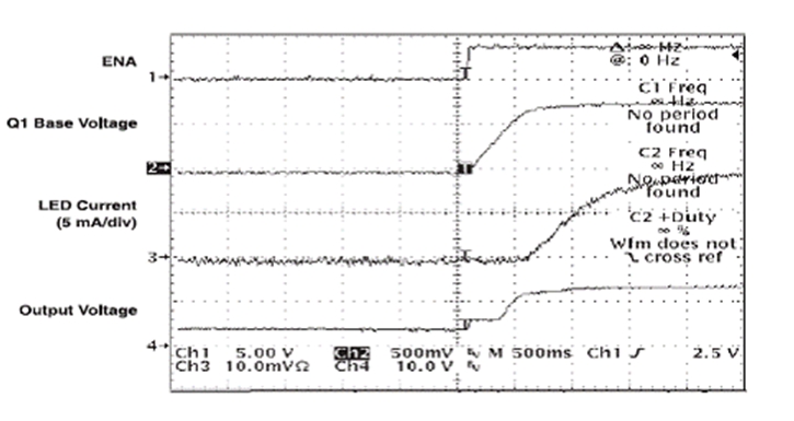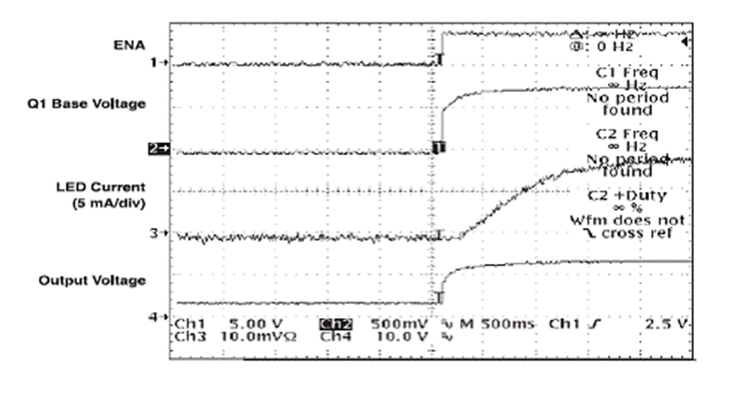 應(yīng)用使能信號 (enable signal) 時,R3 將慢慢給 C3 充電,此舉會慢慢開啟 Q1。TPS61040 會通過 D2 被立即啟用。在電路閉合時,F(xiàn)B 到接地的初始電阻極高,從而將 LED">LED 電流限制為 0 mA。隨著 Q1 慢慢開啟,有效電阻逐漸下降,電阻的下降與 LED">LED 電流的升高有直接的關(guān)系。LED">LED 從亮度為 0% 變?yōu)?100% 的亮度,需時 1 到 2 秒鐘,具體的時間長短取決于選定的時間常數(shù)。圖 3 顯示了電路閉合時的相關(guān)波形。