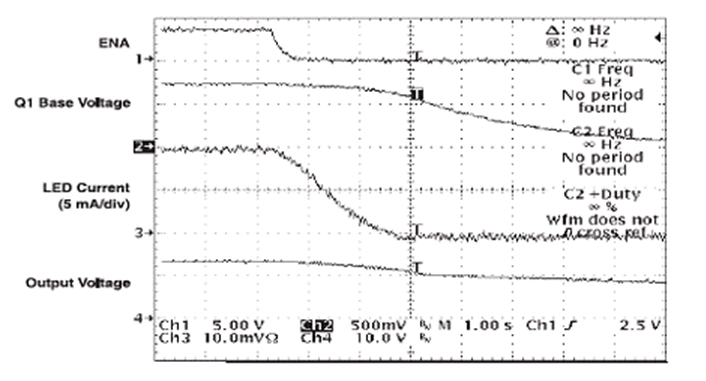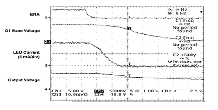 ENA 信號在電路斷開時下降,此時 D2 會阻止 C4 放電。TPS61040 保持開啟狀態(tài),直到 C4 通過 R5 放電。在 TPS61040 仍為開啟狀態(tài)時,C3 開始通過 R3 和 R4 放電。隨著 Q1 可用基線電流 (base current) 的下降,Q1 的有效電阻開始升高。隨著 FB 引腳上總電阻的升高,LED">LED 電流會成比例下降。圖 4 顯示了電路斷開時的相關(guān)波形。