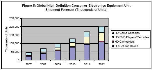 - 預(yù)計到2012年,高清晰度機(jī)頂盒、攝像機(jī)、DVD播放機(jī)和游戲機(jī)的全球出貨量將增至2008年的三倍