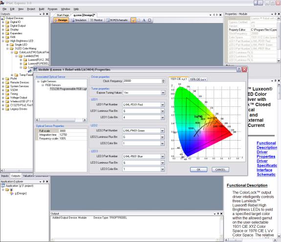 許多色彩系統(tǒng)設計擁有不同的回饋方法,需要花數(shù)個月的時間來開發(fā)韌體。解決bin的調(diào)整、溫度補償、或更高精準度的色彩回饋系統(tǒng)以及校正,都需要了解色彩科學以及精準的傳感器讀數(shù)。在展開任何高亮度LED設計時,強烈建議您先了解這些相關名詞。幸運的是,當您進入市場時,能利用Cypress Semiconductor所提供快速且輕易的PSoC Express 3.0解決方案,協(xié)助您快速展開研發(fā)。所有這些不同的回饋解決方案,以及高亮度LED的補償機制,都收錄在一個簡單易用的圖形化接口,讓您僅須使用下拉式選單以及各種校正技巧,就能完成這些設計。
