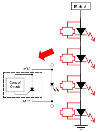 如前所述,LED是一種使用壽命極長(zhǎng)的光源(可長(zhǎng)達(dá)5萬小時(shí))。除了需要針對(duì)具體的LED應(yīng)用選擇適合的LED驅(qū)動(dòng)解決方案,還需要為L(zhǎng)ED提供適當(dāng)?shù)谋Wo(hù),因?yàn)榕紶朙ED也會(huì)失效。其原因多種多樣,可能是因?yàn)長(zhǎng)ED早期失效,也可能是因?yàn)榫植康慕M裝缺陷或是因瞬態(tài)現(xiàn)象導(dǎo)致失效。必須對(duì)這些可能的失效提供預(yù)防措施,特別是因?yàn)槟承?yīng)用屬于關(guān)鍵應(yīng)用(故障停機(jī)成本高),或是安全攸關(guān)的應(yīng)用(如頭燈、燈塔、橋梁、飛行器、飛機(jī)跑道等),或是在地理上難于接近的應(yīng)用(維護(hù)困難)等。在這方面,可以采用安森美半導(dǎo)體的NUD4700 LED分流保護(hù)解決方案。圖5是這種分流保護(hù)解決方案的應(yīng)用及原理示意圖。