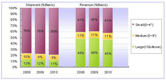 再從出貨尺寸別來看,主要觸控面板的出貨尺寸集中在4寸以下(含4寸),2008年出貨量為3億6,000萬片,占整體市場比重將近79%。同樣地,受到全球經(jīng)濟(jì)衰退的影響,2009年在4寸以下(含4寸)的出貨量雖然目前看來將維持與2008年相仿的水準(zhǔn),但到了2010年預(yù)計(jì)將會有2%的成長幅度。