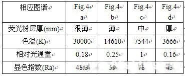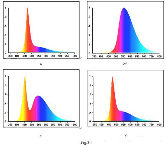 我們曾對此進(jìn)行了實驗研究,我們利用某公司生產(chǎn)的1W高亮度藍(lán)光LED,其光譜的中心輻射波長為470nm見Fig.3,去除外封裝后分別涂敷不同厚度的輻射的中心波長為560nm的黃光熒光粉涂層,經(jīng)處理后測量其發(fā)射光譜。從二十余種不同厚度的樣品中選擇了四種典型情況,其結(jié)果見Fig
