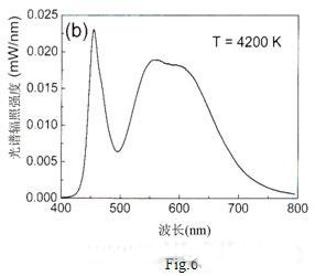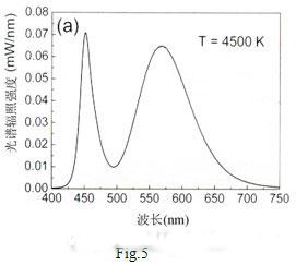 以InGaN藍(lán)光LED和1號熒光粉制成的白光LED的發(fā)射光譜示如Fig.6,其光效為55lm/W,色溫4500K。這是本人所知道白光LED的最高光效報導(dǎo)(據(jù)測試國內(nèi)1W白光LED的光通量大多在40lm以下)。采用2號和3號混合熒光粉試制的白光LED的發(fā)射光譜示如Fig.7,其顯色指數(shù)提高到82,色溫4200K,但光效確降低到20lm/W。