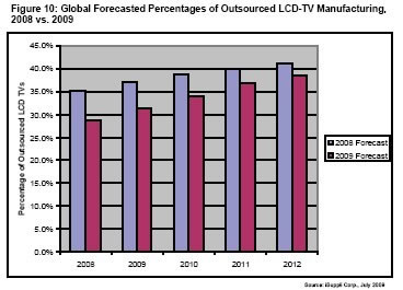 估計(jì)這一趨勢(shì)在2009年還將繼續(xù),外包的LCD-TV比預(yù)期的少5.6%。到2010、2011和2012年,外包量將比先前預(yù)測(cè)的少4.8、3.2和2.6個(gè)百分點(diǎn)。