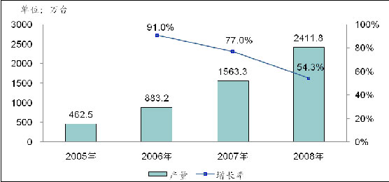 隨著傳統(tǒng)CRT彩電的逐漸被取代,液晶電視的普及已經(jīng)成為不可逆轉(zhuǎn)的趨勢,并且普及的速度在不斷加快。中國作為全球最大的彩電制造基地和彩電消費市場,在彩電工業(yè)的轉(zhuǎn)型過程中,液晶電視的產(chǎn)量也出現(xiàn)了爆發(fā)式的增長。根據(jù)賽迪顧問統(tǒng)計,2005年-2008年,中國液晶電視產(chǎn)量的年均復(fù)合增長率高達73.4%,2008年產(chǎn)量達到2411.8萬臺。