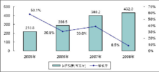 2008年受全球金融危機的影響,液晶面板的市場需求量出現(xiàn)大幅萎縮。2008年全球大尺寸(大于10英寸)TFT-LCD面板銷售量達到4.32億片,比去年3.98億片的銷售量僅僅增長8.5%,遠低于2007年39.0%的增長率,創(chuàng)近5年市場增長率最低。