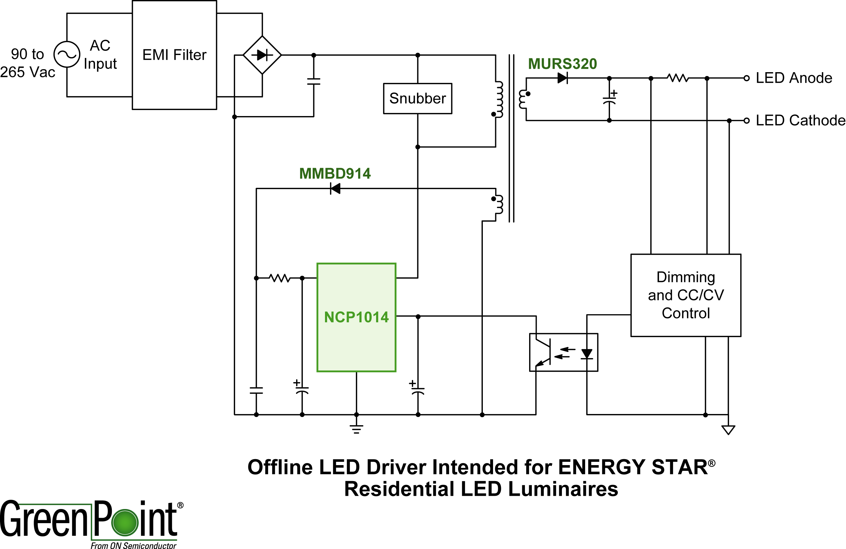 安森美半導(dǎo)體的另一款針對“能源之星”住宅LED照明的離線型LED驅(qū)動器GreenPoint®參考設(shè)計經(jīng)過優(yōu)化,驅(qū)動便攜臺燈、櫥柜內(nèi)照明及戶外走廊燈等應(yīng)用中的1到8顆大功率LED。這參考設(shè)計采用新穎的電路配置,無須增加額外的無源功率因數(shù)校正(PFC)網(wǎng)絡(luò),即可在115 Vac條件下提供高于0.85的功率因數(shù),減少了元器件數(shù)量,并輕松滿足住宅LED應(yīng)用功率因數(shù)要求。這設(shè)計支持90 Vac至265 Vac的通用輸入電壓工作,采用安森美半導(dǎo)體集成了固定頻率電流模式控制器和700 V MOSFET的NCP1014開關(guān)穩(wěn)壓器集成電路(IC)。
