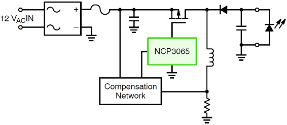 這參考設(shè)計(jì)的一項(xiàng)關(guān)鍵考慮因素,是在12 Vac輸入條件下,跨輸入線路變化及輸出電壓變化,實(shí)現(xiàn)平坦的電流穩(wěn)流。這參考設(shè)計(jì)電路基于安森美半導(dǎo)體的NCP3065構(gòu)建,工作頻率約為150 kHz,采用非隔離型配置。NCP3065是一款單片開關(guān)穩(wěn)壓器,支持12 Vdc或12 Vac電源輸入,設(shè)計(jì)用于為HB-LED提供恒定電流。除了NCP3065,這參考設(shè)計(jì)還結(jié)合了自動(dòng)檢測(cè)電路。這參考設(shè)計(jì)的功能框圖如圖1所示。