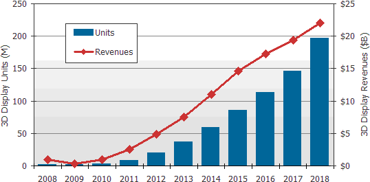 根據(jù)DisplaySearch最新發(fā)表“3D顯示器技術(shù)與市場(chǎng)預(yù)測(cè)分析專題報(bào)告“中顯示,預(yù)估立體3D顯示器市場(chǎng)將從2008年的70萬(wàn)臺(tái),共9億零2百萬(wàn)美元的出貨金額,到2018年將成長(zhǎng)到1億960萬(wàn)臺(tái),共220億美元的出貨金額;其出貨量年度復(fù)合成長(zhǎng)率(CAGR)達(dá)75%,而產(chǎn)值的年度復(fù)合成長(zhǎng)率(CAGR)則為38%。