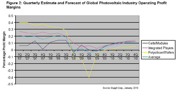 從多晶硅到組件,企業(yè)已通過(guò)閑置生產(chǎn)線和減少班次削減了產(chǎn)量。iSuppli 公司估計(jì),2009 年所有節(jié)點(diǎn)的平均產(chǎn)能利用率為70%。有些企業(yè)全年產(chǎn)品脫銷,而有些企業(yè)則產(chǎn)品過(guò)剩。此外,2009 年許多廠商擴(kuò)充了產(chǎn)能。關(guān)于如何計(jì)算產(chǎn)量存在很大爭(zhēng)論, iSuppli 公司的定義是每周七天、每天24小時(shí)使用已安裝的生產(chǎn)線/設(shè)備。iSuppli 公司認(rèn)為,2010 年產(chǎn)能持續(xù)過(guò)剩或接近過(guò)剩將使價(jià)格持平。