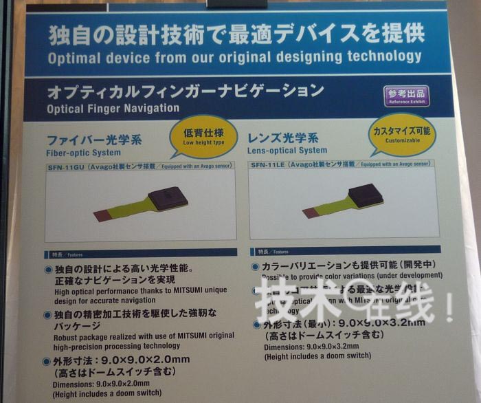 三美電機(jī)開發(fā)出了厚度僅為2mm的光學(xué)式輸入傳感器模塊“SFN-11GU”。設(shè)想用于用一根拇指在手機(jī)畫面上進(jìn)行操作的用途。解說員表示,“如果是觸摸面板的話,大多數(shù)情況下需要一手拿著手機(jī),用另一只手的手指碰觸畫面進(jìn)行操作,而有些顧客希望可以只用單手進(jìn)行操作”。該產(chǎn)品已經(jīng)用于便攜終端產(chǎn)品中。