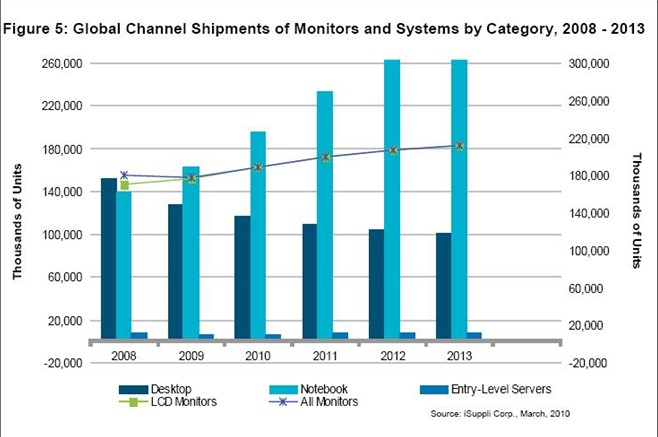 在景氣低迷時期的大部分時間里,顯示器的消費需求實際上強于企業(yè)需求,因為企業(yè)在此期間為了削減成本而裁員和大砍設備支出。2010年及以后,形勢將會發(fā)生轉(zhuǎn)變,企業(yè)客戶將扮演更重要的角色。