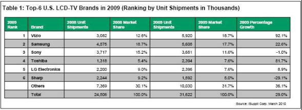 美國Vizio的2009年液晶電視出貨量接近增長一倍,從2008年的310萬臺增長到590萬臺,增長92.1%。這大大高于2009年美國整體液晶電視市場29%的增長率,在六大品牌之中也是最強(qiáng)勁的增長。該公司的市場份額從2008年的12.6%上升到18.7%。