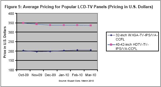 圖5所示為2009年10月至2010年3月流行液晶面板的平均價(jià)格走勢。另外,面板價(jià)格較高,也影響了品牌電視廠商的利潤率。因此,預(yù)計(jì)較高的庫存水平還將保持兩到三周,這將導(dǎo)致電視面板需求速度下降。