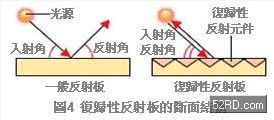 此時(shí)若在顯示器周圍設(shè)置復(fù)數(shù)個(gè)收光器,勢(shì)必會(huì)造成觸控面板制作成本暴增,有鑑于此,研究人員在顯示器周圍黏貼「復(fù)歸性反射板(ReturnReflectorSheet)」,它可以反射來自顯示器周圍任何方向的光線,亦即從感測(cè)器射出的任何光線都會(huì)折返至感測(cè)器,如果被筆或是手指遮蔽時(shí),光線就不會(huì)折返至感測(cè)器(圖4)。
