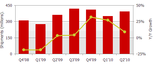 根據(jù)DisplaySearch最新一季手機(jī)面板出貨與預(yù)測報(bào)告指出,手機(jī)市場在2009年Q4強(qiáng)勁反彈,2009年手機(jī)面板全年出貨量達(dá)14億6千萬片,較2008年成長4.4%。而第四季手機(jī)面板出貨量為4億零9百萬片,較去年同期成長32%。雖然出貨量呈現(xiàn)正成長,但由于面板價(jià)格持續(xù)下滑的情況下,出貨金額僅達(dá)116億美元,較去年同期下跌4.7% 。