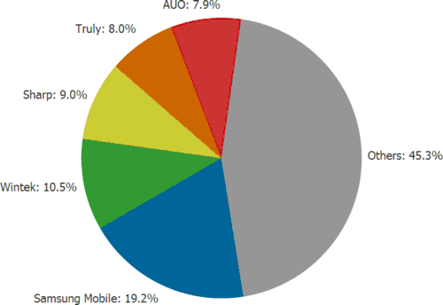 下圖顯示了全球前5大手機(jī)面板供貨商的市占率,前五大廠商占有超過一半市場。三星排名第一,2009年出貨量市占率達(dá)19.2%,其次是勝華科技市占率10.5%,夏普排名第三市占率9.0%,信利與友達(dá)以8.0%及7.9%市占率分居第四與第五位 。