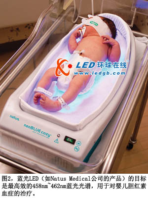 所幸,光療通常對此種病癥有效果,因為膽紅素會吸收藍光,分解為水溶形式而排出體外(圖2)。458nm~462nm區(qū)域中的窄帶藍光最有效。過去,膽紅素治療光線都采用定制的藍色熒光燈管和彩色過濾器。但是,熒光燈的光譜相對較寬。盡管其分布中心位于所需波長上,但光譜分布在兩端下降,表示能破壞膽紅素的光能量下降,因此治療時間將延長。與之相比,藍光LED膽紅素光源可以有正確的頻率,幾乎不浪費光能量。另外,LED的膽紅素光源有機械穩(wěn)定特性,更長的壽命,也比熒光設備低廉。在未來,光線療法將能通過“發(fā)光服”提供光照,提供比光箱更有效的治療方法。