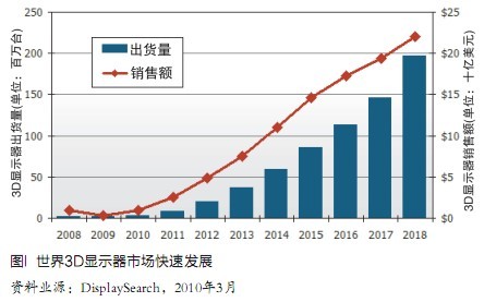 市場(chǎng)研究公司DisplaySearch日前發(fā)表一份專門報(bào)告稱,在3D電影成功的促動(dòng)下,3D顯示器市場(chǎng)將于2010年開始起飛,預(yù)測(cè)3D顯示器出貨量將從2008年的70萬個(gè)增長(zhǎng)到2018年的1.96億個(gè),10年內(nèi)年均增長(zhǎng)率達(dá)75%,同期銷售額從9億美元增長(zhǎng)到220億美元,年均增長(zhǎng)率38%(圖1)。世界消費(fèi)電子廠商將隨著推出一批3D有關(guān)產(chǎn)品,包括電視機(jī)、監(jiān)視器、筆記本電腦、藍(lán)光盤播放器、數(shù)碼相機(jī)、攝像機(jī)、相框等進(jìn)軍家庭市場(chǎng)。加上立體顯示原來就有的醫(yī)療等專業(yè)應(yīng)用以及廣告、公共顯示牌等應(yīng)用,都會(huì)成為促動(dòng)顯示產(chǎn)業(yè)開始從平板產(chǎn)品向著3D大進(jìn)軍,這也是一次從平板顯示轉(zhuǎn)向立體顯示的革命。