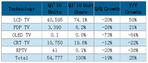 - 2010年第一季所有種類電視機(jī)出貨量較去年同期成長55%