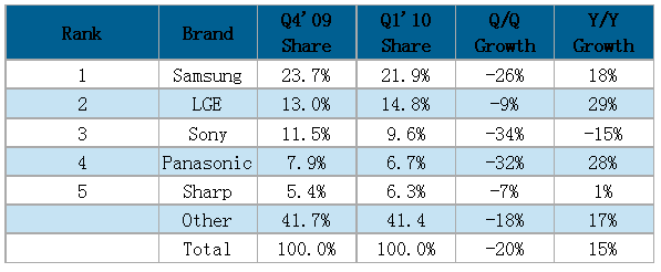 一季度三星電子(Samsung)出貨營收比率較去年第四季稍微下滑,不過利潤率相對(duì)較其它廠商好,出貨金額比率達(dá)21.9%。同時(shí)三星電子持續(xù)在新技術(shù)如LED與3D電視方面領(lǐng)先其它廠商,這也是該公司持續(xù)良好增長與較高產(chǎn)品價(jià)格主要原因。以應(yīng)用技術(shù)別來看,三星電子在LCD TV全球排名第一,在等離子電視則排名第二。