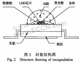Si襯底的功率型GaN基LED封裝采用仿流明的支架封裝形式,其外形有朗柏型、矩形和雙翼型。其制作過程為:使用導(dǎo)熱系數(shù)較高的194合金金屬支架,先將LED芯片粘接在金屬支架的反光杯底部,再通過鍵合工藝將金屬引線連接LED芯片與金屬支架電極,完成電氣連接,最后用有機(jī)封裝材料(如Si膠)覆蓋芯片和電極引線,形成封裝保護(hù)和光學(xué)通道。這種封裝對(duì)于取光效率、散熱性能、加大工作電流密度的設(shè)計(jì)都是最佳的。其主要特點(diǎn)包括:熱阻低(小于10℃/W),可靠性高,封裝內(nèi)部填充穩(wěn)定的柔性膠凝體,在-40~120℃范圍,不會(huì)因溫度驟變產(chǎn)生的內(nèi)應(yīng)力,使金絲與支架斷開,并防止有機(jī)封裝材料變黃,引線框架也不會(huì)因氧化而沾污;優(yōu)化的封裝結(jié)構(gòu)設(shè)計(jì)使光學(xué)效率、外量子效率性能優(yōu)異,其結(jié)構(gòu)見圖2。