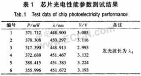 通過優(yōu)化Si襯底表面的處理和緩沖層結(jié)構(gòu),成功生長(zhǎng)出可用于大功率芯片的外延材料。采用Pt電極作為反射鏡,成功實(shí)現(xiàn)大功率芯片的薄膜轉(zhuǎn)移。采用銀作為反射鏡,大大提高了反射效率,通過改進(jìn)反射鏡的設(shè)計(jì)并引入粗化技術(shù),提高了光輸出功率。改進(jìn)了Ag反射鏡蒸鍍前p型GaN表面的清洗工藝和晶片焊接工藝,改善了銀反射鏡的歐姆接觸,量子阱前引入緩沖結(jié)構(gòu),提高了芯片發(fā)光效率,優(yōu)化量子阱/壘界面生長(zhǎng)工藝,發(fā)光效率進(jìn)一步提高,通過改進(jìn)焊接技術(shù),減少了襯底轉(zhuǎn)移過程中芯片裂紋問題,芯片制備的良率大幅度提高,且可靠性獲得改善。通過上述多項(xiàng)技術(shù)的應(yīng)用和改進(jìn),成功制備出尺寸1mm×1mm,350mA下光輸出功率大于380mW的藍(lán)色發(fā)光芯片,發(fā)光波長(zhǎng)451nm,工作電壓3.2V,完成課題規(guī)定的指標(biāo)。表1為芯片光電性能參數(shù)測(cè)試結(jié)果。