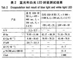 根據(jù)LED的光學(xué)結(jié)構(gòu)及芯片、封裝材料的性能,建立了光學(xué)設(shè)計(jì)模型和軟件仿真手段,優(yōu)化了封裝的光學(xué)結(jié)構(gòu)設(shè)計(jì)。通過封裝工藝技術(shù)改進(jìn),減少了光的全反射,提高了產(chǎn)品的取光效率。改進(jìn)導(dǎo)電膠的點(diǎn)膠工藝方式,并對(duì)裝片設(shè)備工裝結(jié)構(gòu)與精度進(jìn)行了改進(jìn),采用電熱隔離封裝結(jié)構(gòu)和優(yōu)化的熱沉設(shè)計(jì),降低了器件熱阻,提高了產(chǎn)品散熱性能。采用等離子清洗工藝,改善了LED封裝界面結(jié)合及可靠性。針對(duì)照明應(yīng)用對(duì)光源的光色特性的不同要求,研究暖白、日光白、冷白光LED顏色的影響因素:芯片參數(shù)、熒光粉性能、配方、用量,并通過改進(jìn)熒光膠涂覆工藝,提高了功率LED光色參數(shù)的控制能力,生產(chǎn)出與照明色域規(guī)范對(duì)檔的產(chǎn)品。藍(lán)光和白光LED封裝測(cè)試結(jié)果見表2。表中:φ為光通量;K為光效;P為光功率;R為熱阻;μ為光衰;I為飽和電流。