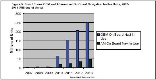 - 2010年基于智能手機(jī)的OEM和售后市場on-board導(dǎo)航系統(tǒng)使用量預(yù)計(jì)增長九倍