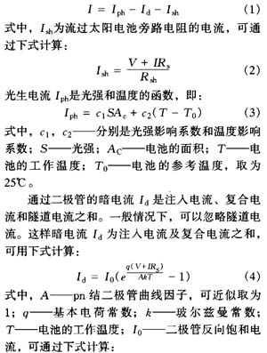 如果在太陽電池兩端接上一個負載電阻RI,那么太陽電池在工作狀態(tài)下的等效電路如圖l所示。它相當于一個電流為J9h的恒流源與一只正向二極管并聯(lián)。流過二極管的正向電流在太陽電池中稱為暗電流Id。Rsh稱為旁路電阻.主要由下列幾種因素引起:如表面沾污而產(chǎn)生的沿著電池邊緣的表面漏電流;沿著位錯微觀裂縫、晶粒間界和晶體缺陷等形成的細小橋路而產(chǎn)生的漏電流。Rs稱為串聯(lián)電阻,系由擴散頂區(qū)的表面電阻、電池的體電阻和上下電極與太陽電池之間的歐姆電阻及金屬導體的電阻構成的。