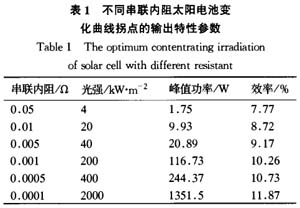 從圖2也可以看出,太陽電池的峰值功率隨光強的升高而首先直線上升,升高到一定程度后,曲線變得平緩。不同串聯(lián)內(nèi)阻的太陽電池峰值功率變化曲線的拐點如表l所示。對于直徑為10cm的常規(guī)太陽電池,其串聯(lián)內(nèi)阻一般在0.05—0.010之間。由表l可知,若采用聚光系統(tǒng)性能好(串聯(lián)內(nèi)阻小)的常規(guī)太陽電池最多可以在20倍光強下工作,能得到較好的效果,若再增加光強,收效很小,反而增加了成本。對于一般常規(guī)太陽電池可能只能在幾倍光強下得到較好的收益。若想使太陽電池工作在更高的光強下,必須采取措施,降低電池的串聯(lián)內(nèi)阻,這樣勢必會增加大陽電池的成本,而且串聯(lián)電阻越小,其成本會越高,因此并不是光強越高越好,而是存在一個成本最低的最佳光強。
