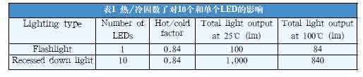 乍一看,16%的LED光通減少量影響可能不大。然而,當考慮到一個照明裝置由多個LED組成時,這個問題就嚴重了。用10個LED組成的嵌筒燈同一個LED組成的手電筒比較,熱/冷因數(shù)的影響就顯現(xiàn)出來了。