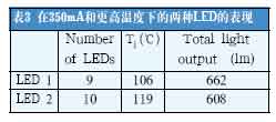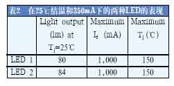 在數(shù)據(jù)表描述的25℃結溫和350mA的前向電流下,LED2的性能比LED1要好。但是,更實際的比較將在更高的結溫下進行(見表3)。