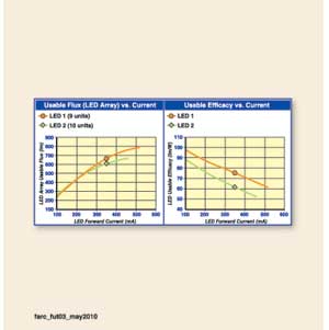 由于LED1的高熱/冷因數(shù),9個LED1的總光輸出比10個LED2高出50lm。盡管在25℃時,LED1的額定光通低于LED2,但在350mA的電流驅動下,其性能要超過LED2。圖3(左)顯示了LED1在任何前向電流的驅動下,都比LED2高出100mA。圖3(右)顯示了在同樣的電流驅動下,LED1的效能要高過LED2。