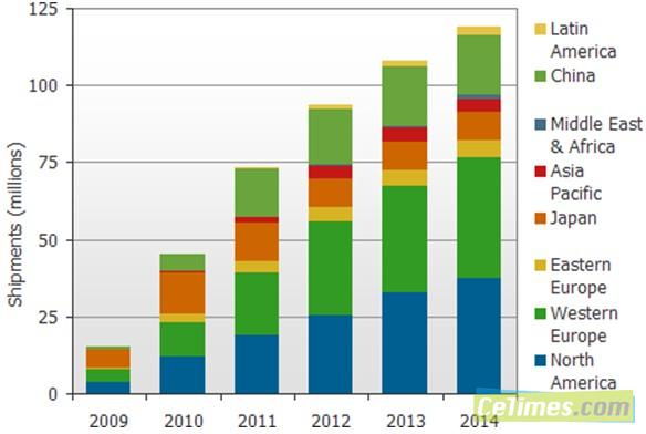 經(jīng)過針對許多一線品牌2010年新產(chǎn)品線的調(diào)查分析,報告中指出,全球地區(qū)包含日本、北美、歐洲、中國和印度等地,已經(jīng)有55%的電視機(jī)型擁有DLNA(數(shù)字生活網(wǎng)絡(luò)聯(lián)盟,Digital Living Network Alliance)的認(rèn)證。整體而言, 聯(lián)網(wǎng)電視在2010年中預(yù)計(jì)將有4千5百萬臺的出貨量,約占有全年度所有電視出貨量的19%。DisplaySearch更進(jìn)一步預(yù)測,預(yù)計(jì)到了2014年時聯(lián)網(wǎng)電視將會有約1億1千9百萬臺的出貨量,占有總出貨量的42%之多。