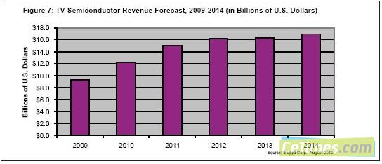 2009年電視半導(dǎo)體銷售額高達93億美元,由于液晶電視需要更多的半導(dǎo)體芯片支持各種高級功能,2010年銷售額有望更上層樓。iSuppli公司的預(yù)測顯示,2010年電視半導(dǎo)體市場將達到121億美元。