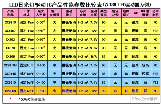 表1LED日光燈驅(qū)動IC產(chǎn)品性能參數(shù)比較表