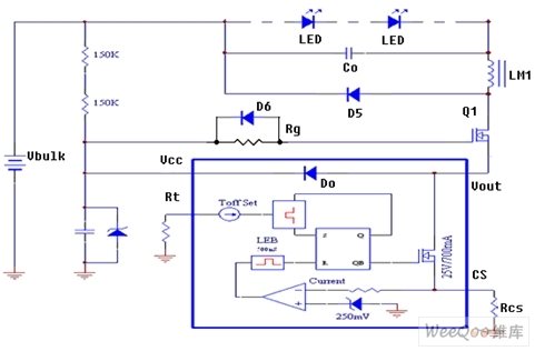 圖5是源極驅(qū)動控制電原理路,從中可見BP2808內(nèi)部的低壓開關(guān)MOS管(700mA)漏極連接到外部功率開關(guān)MOS管Q1的源極,而其源極連接到采樣電阻RCS的一端以及第一比較器的輸入端,其柵極連接到RS觸發(fā)器的輸出端。外部功率開關(guān)MOS管Q1的漏極輸出電流經(jīng)儲能電感直接驅(qū)動LED光源。芯片內(nèi)的Do是饋流二極管,在BP2808啟動工作后,從OUT到VCC的饋流經(jīng)Do整流向BP2808提供工作電源。