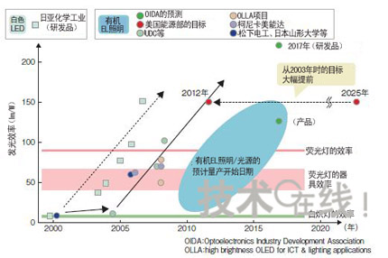 政府機構(gòu)的資助額大多為3年內(nèi)數(shù)億~30億日元的規(guī)模,德國“OPAL(OrganicPhosphorescentlightsforApplicationsintheLightingmarket)”項目為5年內(nèi)1億歐元(約合140億日元),遠遠多于其他項目。在發(fā)光效率方面迅速追趕白色LED有機EL照明雖然具有一些獨特的特點,但考慮到實際影后,還是避免不了在發(fā)光效率、使用壽命、成本等基本性能上與白色LED及現(xiàn)有照明技術(shù)一決高低。近來有機EL照明的性能得到了大幅提高。首先是發(fā)光效率。目前,有機EL照明在研發(fā)水平上比白色LED約落后約2年。2008年6月美國UniversalDisplay(UDC)發(fā)布的“102lm/W”的發(fā)光效率,與2006年3月日本日亞化學工業(yè)發(fā)布的白色LED的發(fā)光效率不相上下。山形大學的城戶表示,“已經(jīng)看到了實現(xiàn)200lm/W的曙光”)。