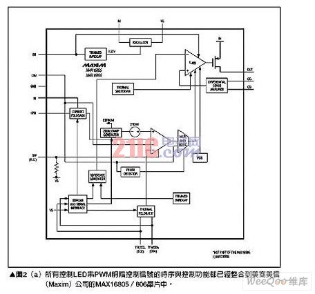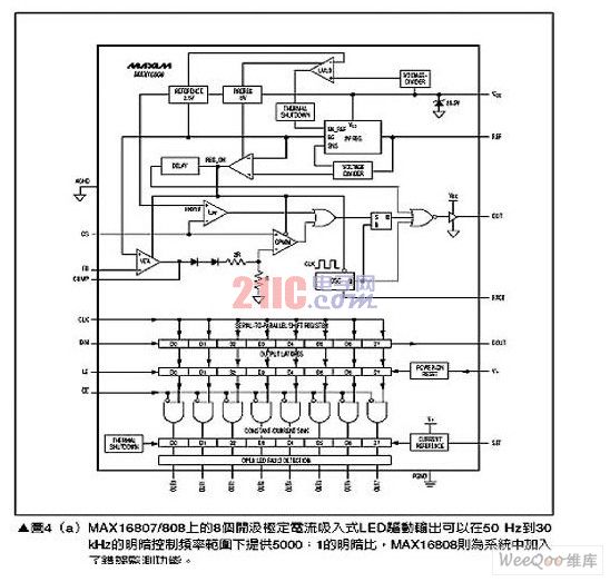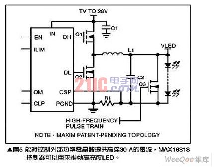 對(duì)于需要高照明功率,例如照明燈或霧燈等應(yīng)用就必須使用多個(gè)高亮度LED(HighBrightLED;HBLED),但是高亮度LED卻需要超高驅(qū)動(dòng)電流,要產(chǎn)生所需的電流會(huì)使用太多的驅(qū)動(dòng)芯片,因此較簡(jiǎn)單的解決方案是使用可以推動(dòng)高電流晶體管的控制器,為高亮度LED提供高達(dá)30A的電流,這類組件的一個(gè)范例為MAX16818,請(qǐng)參考圖5。