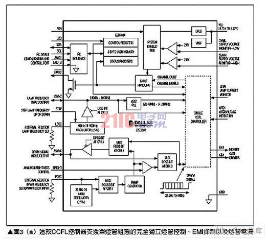 傳統(tǒng)上LCD面板使用CCFL燈管作為背光源,主要是這項(xiàng)技術(shù)擁有良好效率、低溫以及高照明能力等優(yōu)勢(shì),雖然CCFL控制器在非汽車類應(yīng)用中,例如液晶電視或液晶顯示器上相當(dāng)成功,但汽車的工作環(huán)境卻對(duì)這項(xiàng)技術(shù)帶來(lái)特殊的挑戰(zhàn)與要求,為了讓元件數(shù)減少,CCFL控制器必須包含包括如EMI抑制、燈管電流過(guò)度驅(qū)動(dòng)(overdrive)能力,以及將接腳數(shù)降到最低的串行控制接口、各信道燈管失效監(jiān)測(cè)、燈管頻率與DPWM控制用精確內(nèi)建振蕩電路以及其它功能等,這類解決方案有美信(Maxim)公司的DS3881,請(qǐng)參考圖3(a),其只需少許的外加電路,就能夠組合出完整的CCFL電源控制子系統(tǒng),請(qǐng)參考圖3(b)。DS3881主要針對(duì)汽車應(yīng)用環(huán)境進(jìn)行最佳化設(shè)計(jì),由于所采用的基礎(chǔ)電路組態(tài),因此外部晶體管、變壓器以及燈管本身就形成了EMI的噪聲來(lái)源,DS3881通過(guò)使用展頻與頻率偏移技術(shù)來(lái)降低EMI發(fā)射,并將任何未移除噪聲移到非關(guān)鍵頻帶來(lái)解決這個(gè)問(wèn)題。