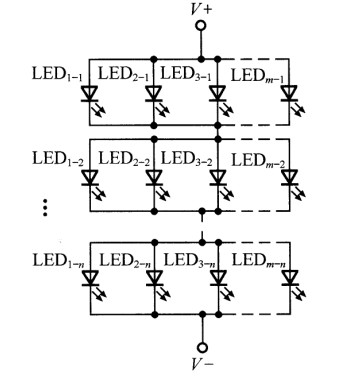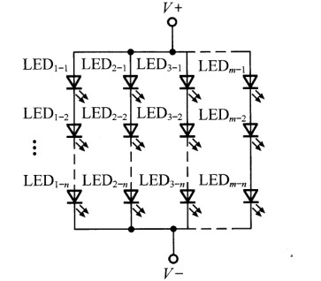 若干個(gè)LED先并后串的混聯(lián)形式如圖6所示。由于LED1-n~LEDm-n先并聯(lián)連接,提高了每組LED故障下的可靠性,但是由此一來每組并聯(lián)LED的均流問題就至關(guān)重要。為此,可以通過配對(duì)挑選,將工作電壓和電流盡量相同的LED作為并聯(lián)的一組,或者給每個(gè)LED串接小的均流電阻來解決。這種混聯(lián)形式具有的其他特點(diǎn)和存在的問題,與先串后并連接形式相類似。