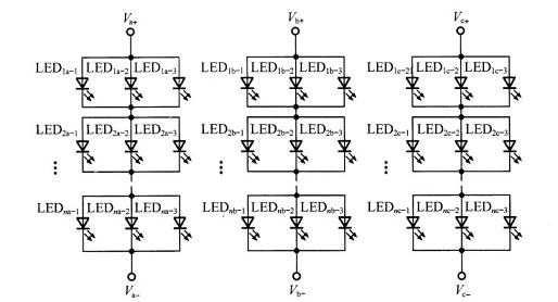 交叉陣列形式主要是為了提高LED工作的可靠性,降低故障率。主要構(gòu)成形式是:每串以3個(gè)LED為一組,分別接入驅(qū)動(dòng)器輸出的Va、Vb、Vc輸出端。當(dāng)一串中的3個(gè)LED都正常時(shí),3個(gè)LED同時(shí)發(fā)光;一旦其中一個(gè)或兩個(gè)LED失效開路時(shí),可以保證至少有一個(gè)LED正常工作。這樣一來就能夠大大地提高每組LED發(fā)光的可靠性,也就能夠提高整個(gè)LED發(fā)光的總體可靠性。