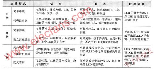 不同的連接形式具有各自不同的特點(diǎn),并且對(duì)驅(qū)動(dòng)器的要求也不相同,特別是在單個(gè)LED發(fā)生故障時(shí)電路工作的情況、整體發(fā)光的可靠性、保證整體LED盡量能夠繼續(xù)工作的能力、減少總體LED的失效率等就顯得尤為重要。表1給出了采用不同連接形式時(shí)的相關(guān)情況的比較。