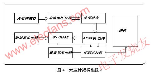 為了精確測(cè)量光通量,把光源放在積分球中。經(jīng)過V(λ)校準(zhǔn)的光電探測(cè)器接受光信號(hào),其輸出的電信號(hào)經(jīng)過放大轉(zhuǎn)換電路,將光電探測(cè)器輸出的光電流信號(hào)轉(zhuǎn)換成較大的電壓信號(hào),利用AD轉(zhuǎn)換器進(jìn)行采樣。由于單片機(jī)讀取和存儲(chǔ)數(shù)據(jù)速度較慢,故而采用了雙口RAM和地址發(fā)生電路,使得光度計(jì)能夠在采用時(shí)自動(dòng)對(duì)數(shù)據(jù)進(jìn)行存儲(chǔ)。單片機(jī)則在所有采樣過程執(zhí)行完畢后,再?gòu)碾p口RAM內(nèi)讀取數(shù)據(jù),并發(fā)送給微機(jī)顯示處理。系統(tǒng)結(jié)構(gòu)圖和實(shí)物連接圖如下。