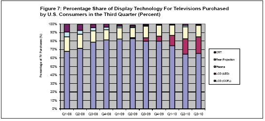 第三季度,大多數(shù)美國(guó)消費(fèi)者繼續(xù)購買老式的非LED型液晶電視,即CCFL電視。第三季度CCFL液晶電視占總體美國(guó)電視市場(chǎng)的份額從第二季度的64.6%升到65.3%,等離子、背投和CRT等其它顯示技術(shù)所占份額相應(yīng)下降。
