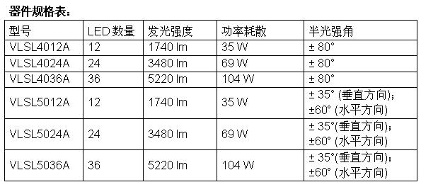 每個模塊皆配有12、24或36個高亮度LED,VLSL40xxA采用VLSL-REFL01反射鏡調整發(fā)光特性,而VLSL50xxA的發(fā)光呈蝶型。
